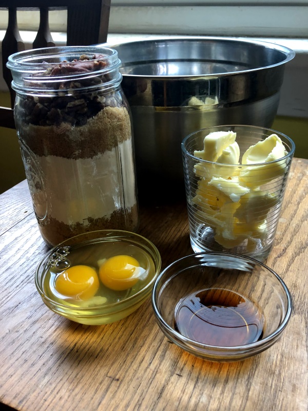 Chewy Pecan Cooking Bars Ingredients 03 Published May 19, 2019 at 600 × 800 in Chewy Pecan Cooking Bars Ingredients 03 mixing bowl with chewy pecan bars cookie mix in mason jar and other ingredients to make cookies