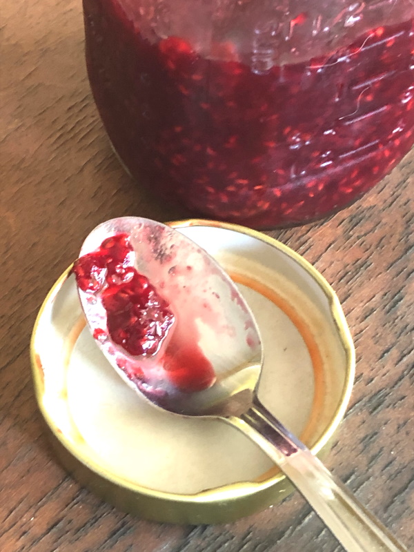 Raspberry Syrup 03 Published November 15, 2020 at 600 × 800 in Raspberry Syrup 03 spoon coated in homemade raspberry syrup resting in lid of mason jar